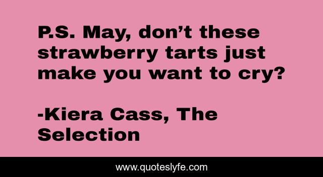 This page presents the quote "P.S. May, don’t these strawberry tarts just make you want to cry?". Author of this quote is Kiera Cass, The Selection. This quote is about may, america,.