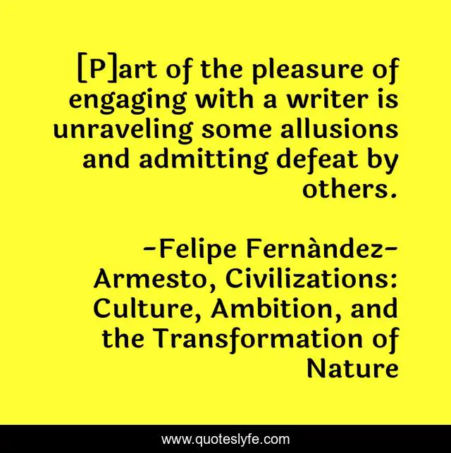 This page presents the quote "[P]art of the pleasure of engaging with a writer is unraveling some allusions and admitting defeat by others.". Author of this quote is Felipe Fernández-Armesto, Civilizations: Culture, Ambition, and the Transformation of Nature. This quote is about books, reading,.
