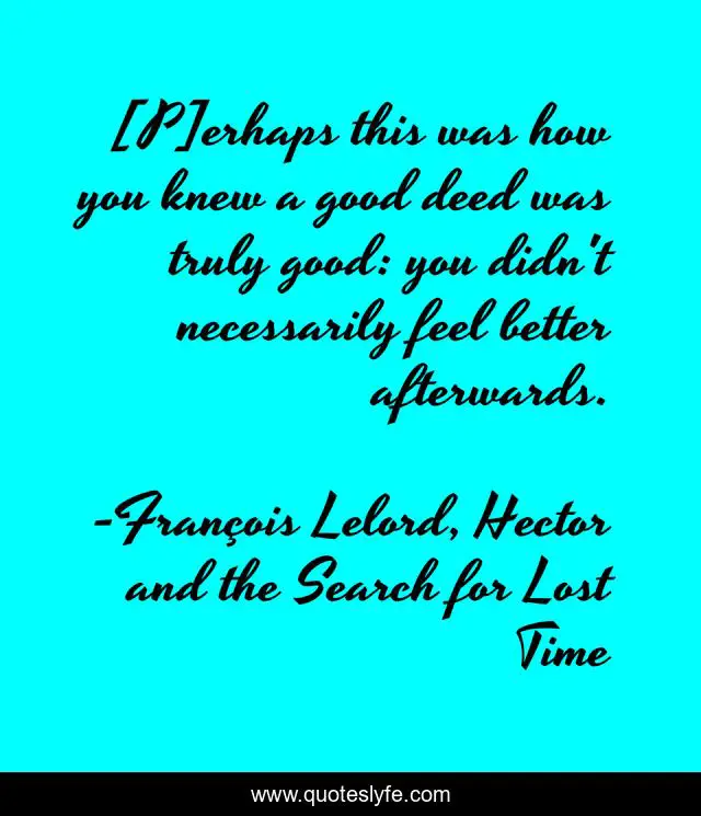 This page presents the quote "[P]erhaps this was how you knew a good deed was truly good: you didn't necessarily feel better afterwards.". Author of this quote is François Lelord, Hector and the Search for Lost Time. .