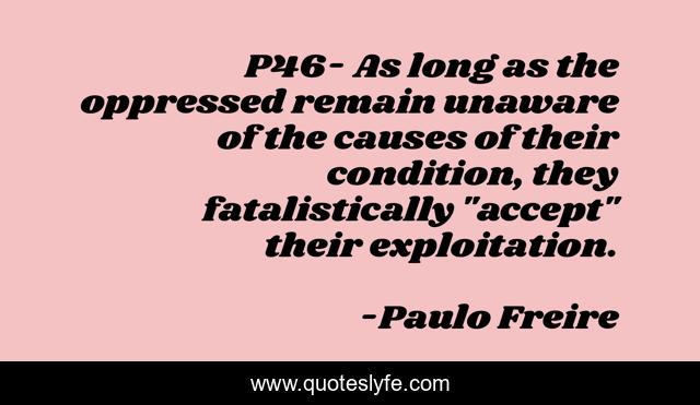 This page presents the quote "P46- As long as the oppressed remain unaware of the causes of their condition, they fatalistically "accept" their exploitation.". Author of this quote is Paulo Freire. .