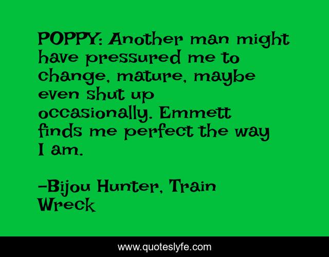 This page presents the quote "POPPY: Another man might have pressured me to change, mature, maybe even shut up occasionally. Emmett finds me perfect the way I am.". Author of this quote is Bijou Hunter, Train Wreck. This quote is about new-adult-romance, self-acceptance, mc-romance, true-love,.