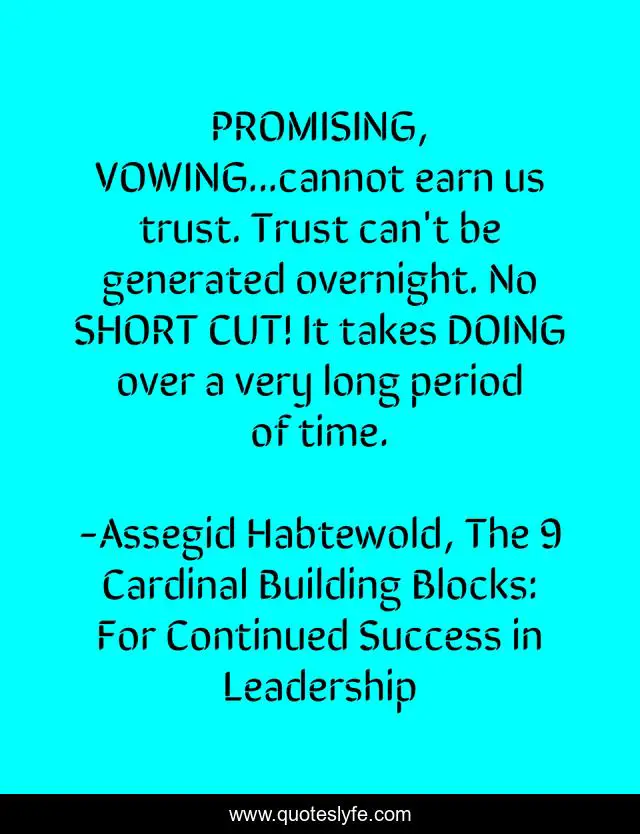 This page presents the quote "PROMISING, VOWING...cannot earn us trust. Trust can't be generated overnight. No SHORT CUT! It takes DOING over a very long period of time.". Author of this quote is Assegid Habtewold, The 9 Cardinal Building Blocks: For Continued Success in Leadership. This quote is about short-cut, trust, overnight, vowing, promising,.
