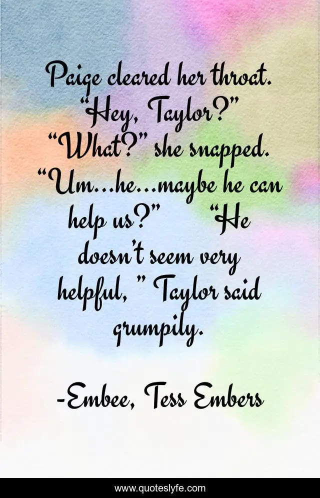 This page presents the quote "Paige cleared her throat. “Hey, Taylor?” “What?” she snapped. “Um...he...maybe he can help us?” “He doesn’t seem very helpful, ” Taylor said grumpily.". Author of this quote is Embee, Tess Embers. .