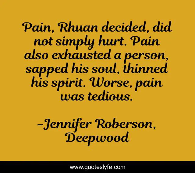 This page presents the quote "Pain, Rhuan decided, did not simply hurt. Pain also exhausted a person, sapped his soul, thinned his spirit. Worse, pain was tedious.". Author of this quote is Jennifer Roberson, Deepwood. This quote is about humor, pain,.