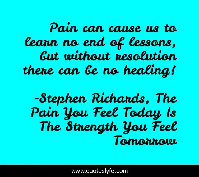 This page presents the quote "Pain can cause us to learn no end of lessons, but without resolution there can be no healing!". Author of this quote is Stephen Richards, The Pain You Feel Today Is The Strength You Feel Tomorrow. This quote is about empowering, confidence, moving-on-and-letting-go, healing-the-past, motivational, forgive, stephen-richards-author, stephen-richards, suffering,.