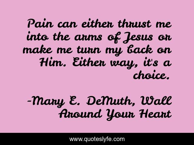 This page presents the quote "Pain can either thrust me into the arms of Jesus or make me turn my back on Him. Either way, it's a choice.". Author of this quote is Mary E. DeMuth, Wall Around Your Heart. This quote is about jesus, pain, hurt, religion, choose, choices,.