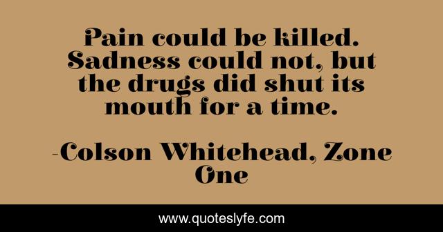 This page presents the quote "Pain could be killed. Sadness could not, but the drugs did shut its mouth for a time.". Author of this quote is Colson Whitehead, Zone One. This quote is about drugs, sadness, medication, pain, antidepressants,.