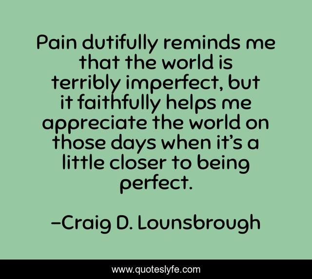 This page presents the quote "Pain dutifully reminds me that the world is terribly imperfect, but it faithfully helps me appreciate the world on those days when it’s a little closer to being perfect.". Author of this quote is Craig D. Lounsbrough. This quote is about perfect, imperfect, appreciation, angst, appreciate, hurt, difficulty, perspective, remind,.