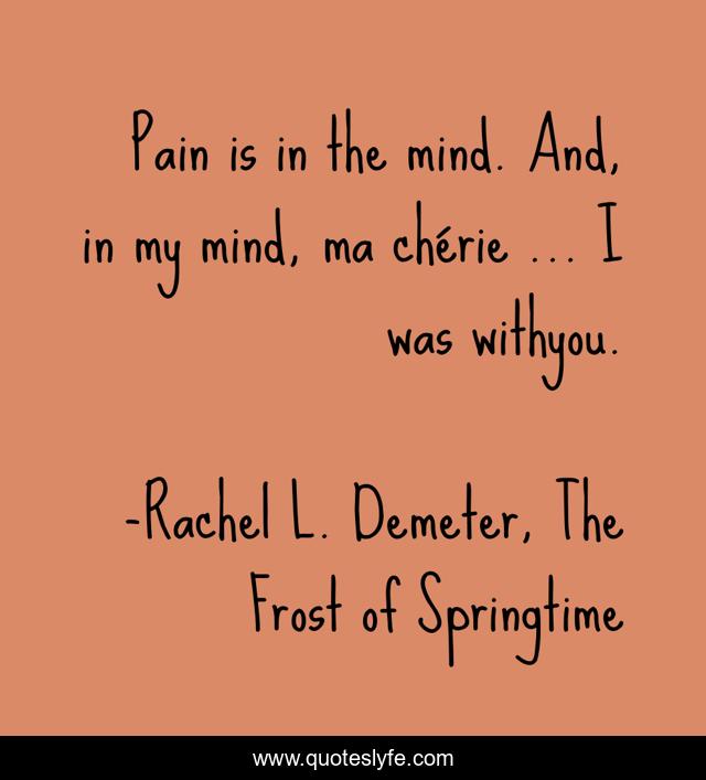 This page presents the quote "Pain is in the mind. And, in my mind, ma chérie … I was withyou.". Author of this quote is Rachel L. Demeter, The Frost of Springtime. This quote is about the-frost-of-springtime, historical-romance,.