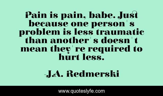 This page presents the quote "Pain is pain, babe. Just because one person's problem is less traumatic than another's doesn't mean they're required to hurt less.". Author of this quote is J.A. Redmerski. .