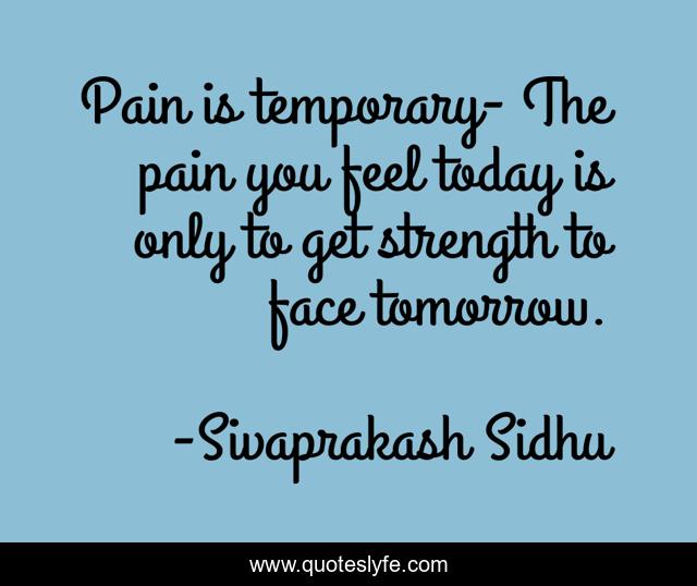 This page presents the quote "Pain is temporary- The pain you feel today is only to get strength to face tomorrow.". Author of this quote is Sivaprakash Sidhu. This quote is about lessons-in-life, sivaprakash-sidhu, lessons-learned-in-life, lesson-for-life, sivaprakash, hurt-feelings, sivaprakash-gopal, failure, rejections,.