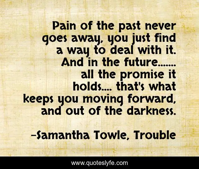 This page presents the quote "Pain of the past never goes away, you just find a way to deal with it. And in the future....... all the promise it holds.... that's what keeps you moving forward, and out of the darkness.". Author of this quote is Samantha Towle, Trouble. This quote is about must-read, promises, love, contemporary-romance, favorite-book, mia, let-go, favorite, favorite-lines,.