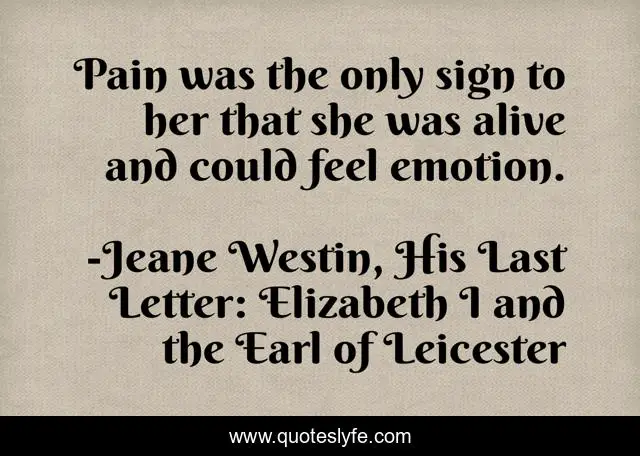 This page presents the quote "Pain was the only sign to her that she was alive and could feel emotion.". Author of this quote is Jeane Westin, His Last Letter: Elizabeth I and the Earl of Leicester. This quote is about elizabeth-i, pain, emotions, feeling-alive,.