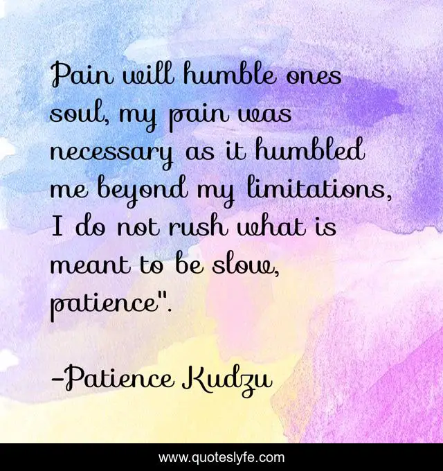 This page presents the quote "Pain will humble ones soul, my pain was necessary as it humbled me beyond my limitations, I do not rush what is meant to be slow, patience".". Author of this quote is Patience Kudzu. This quote is about love, humble, pain, affection, poem,.