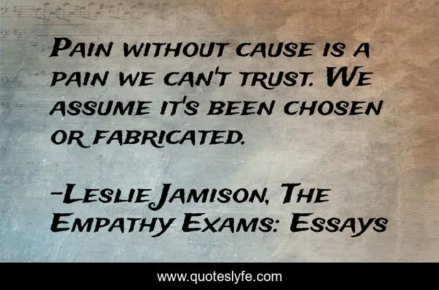 This page presents the quote "Pain without cause is a pain we can't trust. We assume it's been chosen or fabricated.". Author of this quote is Leslie Jamison, The Empathy Exams: Essays. This quote is about suffering, empathy, pain,.