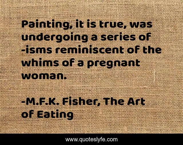 This page presents the quote "Painting, it is true, was undergoing a series of -isms reminiscent of the whims of a pregnant woman.". Author of this quote is M.F.K. Fisher, The Art of Eating. This quote is about culture, art, society,.