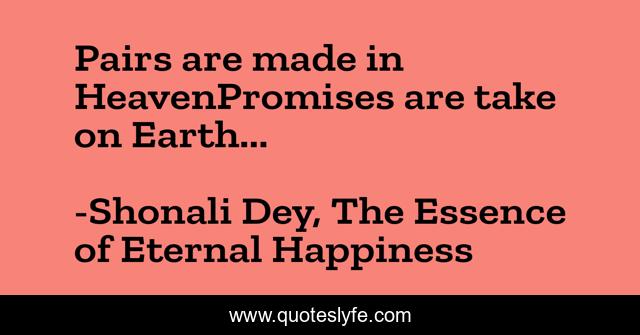 "Shonali Dey, The Essence of Eternal Happiness Quotes." Quoteslyfe.com, 2025. Sat. 06 Dec. 2025. <https://www.quoteslyfe.com/quote/Pairs-are-made-in-HeavenPromises-are-take-183485>.