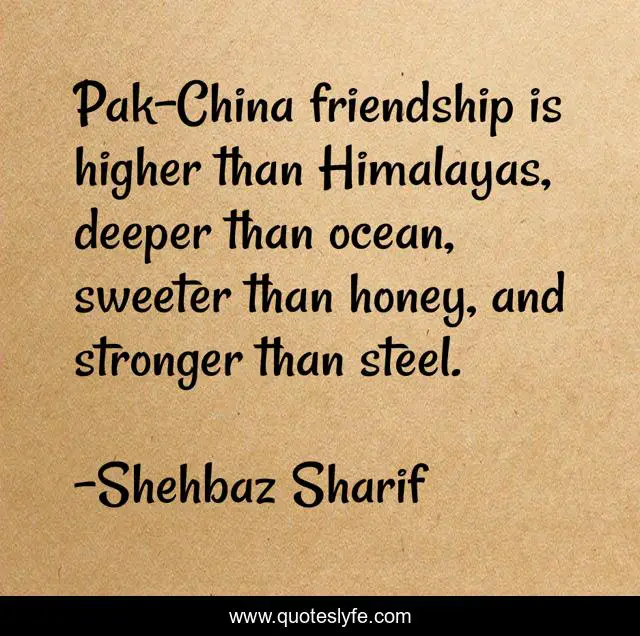 "Shehbaz Sharif Quotes." Quoteslyfe.com, 2025. Mon. 08 Dec. 2025. <https://www.quoteslyfe.com/quote/Pak-China-friendship-is-higher-than-Himalayas-318913>.