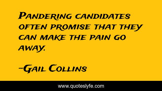 This page presents the quote "Pandering candidates often promise that they can make the pain go away.". Author of this quote is Gail Collins. This quote is about and-rhetoric, discipleship, self-indulgence,.