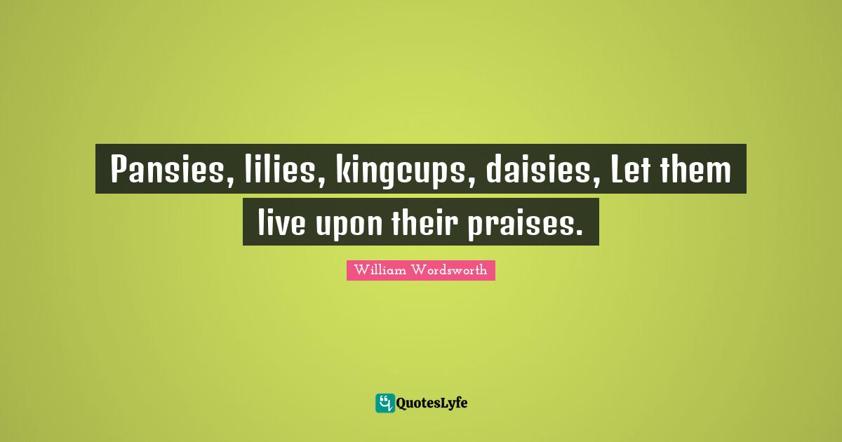 This page presents the quote "Pansies, lilies, kingcups, daisies, Let them live upon their praises.". Author of this quote is William Wordsworth. This quote is about pansies, daisies, lilies, praise,.