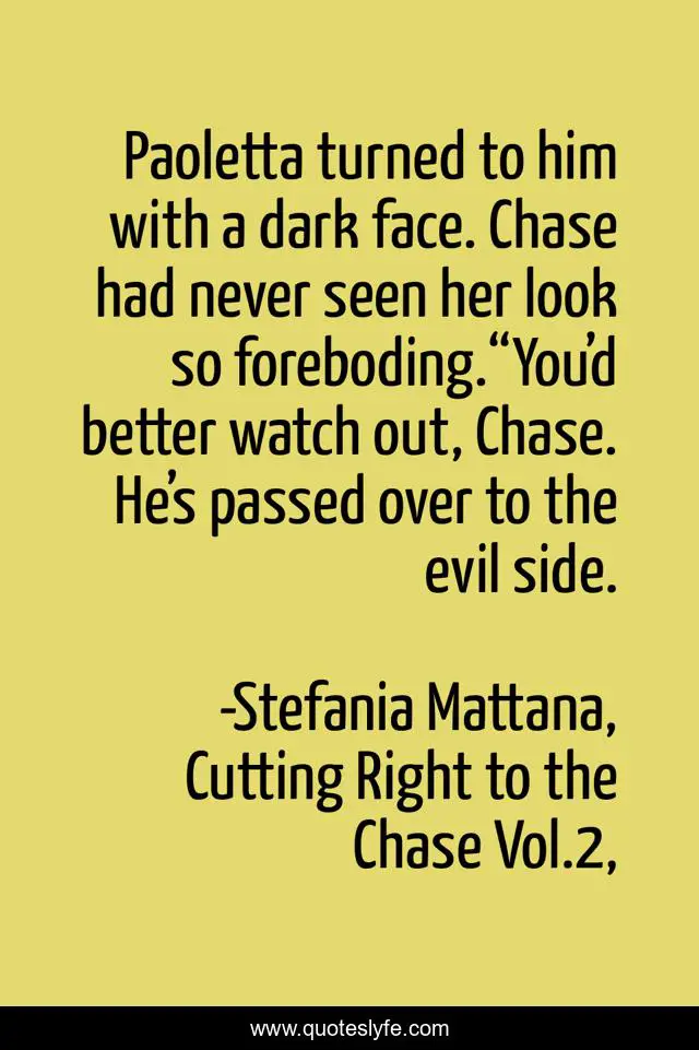 This page presents the quote "Paoletta turned to him with a dark face. Chase had never seen her look so foreboding.“You’d better watch out, Chase. He’s passed over to the evil side.". Author of this quote is Stefania Mattana, Cutting Right to the Chase Vol.2,. This quote is about mystery, italy, cozy-mystery, crime, short-stories, british-detectives,.