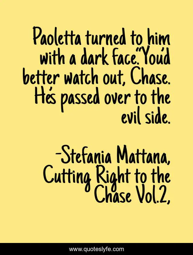This page presents the quote "Paoletta turned to him with a dark face.“You’d better watch out, Chase. He’s passed over to the evil side.". Author of this quote is Stefania Mattana, Cutting Right to the Chase Vol.2,. This quote is about mystery, italy, cozy-mystery, crime, short-stories, british-detectives,.