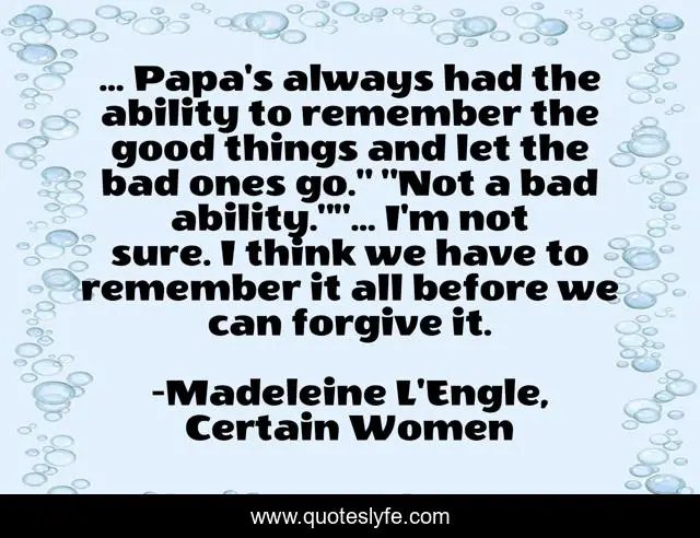 This page presents the quote "... Papa's always had the ability to remember the good things and let the bad ones go." "Not a bad ability.""... I'm not sure. I think we have to remember it all before we can forgive it.". Author of this quote is Madeleine L'Engle, Certain Women. This quote is about relationships, forgiveness,.