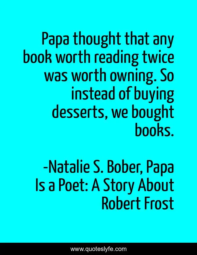 This page presents the quote "Papa thought that any book worth reading twice was worth owning. So instead of buying desserts, we bought books.". Author of this quote is Natalie S. Bober, Papa Is a Poet: A Story About Robert Frost. This quote is about libraries, robert-frost, books,.