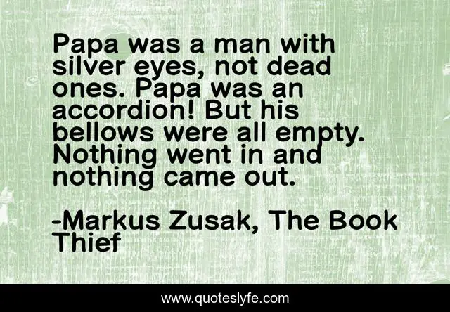 This page presents the quote "Papa was a man with silver eyes, not dead ones. Papa was an accordion! But his bellows were all empty. Nothing went in and nothing came out.". Author of this quote is Markus Zusak, The Book Thief. This quote is about accordions, fathers, death,.