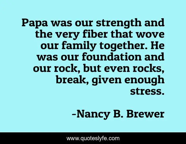 This page presents the quote "Papa was our strength and the very fiber that wove our family together. He was our foundation and our rock, but even rocks, break, given enough stress.". Author of this quote is Nancy B. Brewer. .