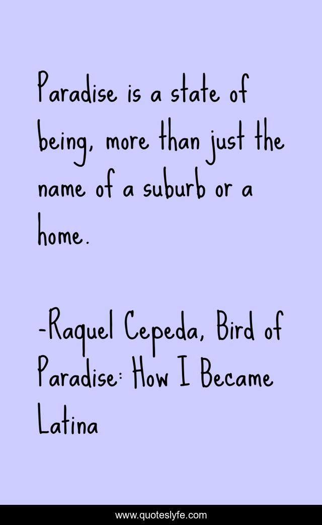This page presents the quote "Paradise is a state of being, more than just the name of a suburb or a home.". Author of this quote is Raquel Cepeda, Bird of Paradise: How I Became Latina. This quote is about being, suburbia, state-of-being, spirituality, paradise, home,.
