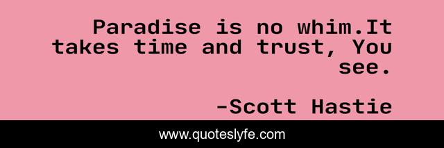 This page presents the quote "Paradise is no whim.It takes time and trust, You see.". Author of this quote is Scott Hastie. This quote is about faith, whim, wise, time, poetry, wisdom, see, truth, paradise,.