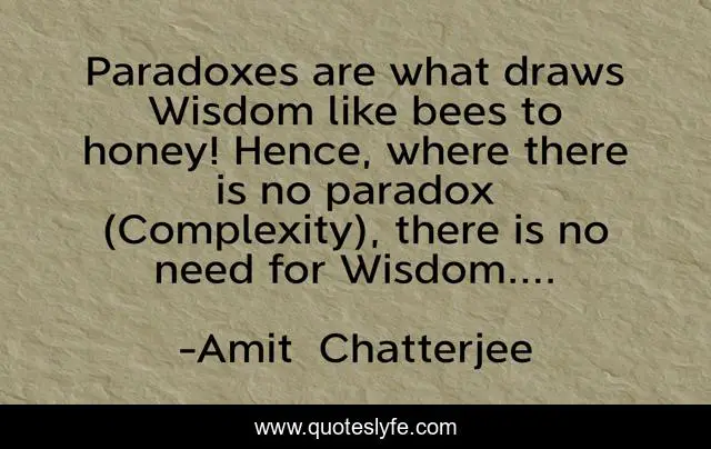 This page presents the quote "Paradoxes are what draws Wisdom like bees to honey! Hence, where there is no paradox (Complexity), there is no need for Wisdom....". Author of this quote is Amit Chatterjee. This quote is about complexity, leadership, paradox, wisdom,.