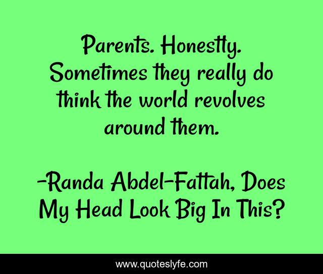 This page presents the quote "Parents. Honestly. Sometimes they really do think the world revolves around them.". Author of this quote is Randa Abdel-Fattah, Does My Head Look Big In This?. This quote is about humor, parents, universe,.