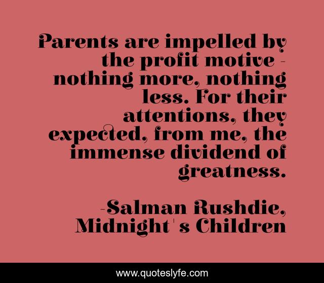 This page presents the quote "Parents are impelled by the profit motive - nothing more, nothing less. For their attentions, they expected, from me, the immense dividend of greatness.". Author of this quote is Salman Rushdie, Midnight's Children. This quote is about parenting, parents, expectations, illusions,.