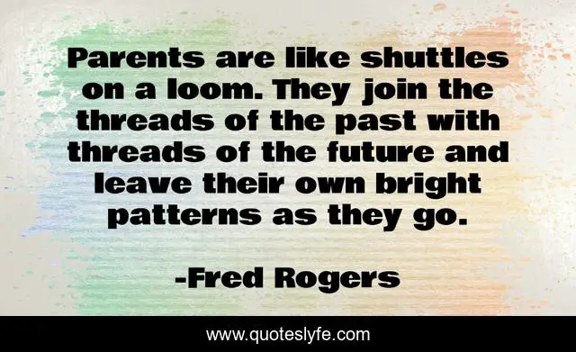 This page presents the quote "Parents are like shuttles on a loom. They join the threads of the past with threads of the future and leave their own bright patterns as they go.". Author of this quote is Fred Rogers. This quote is about past, bright, parents,.