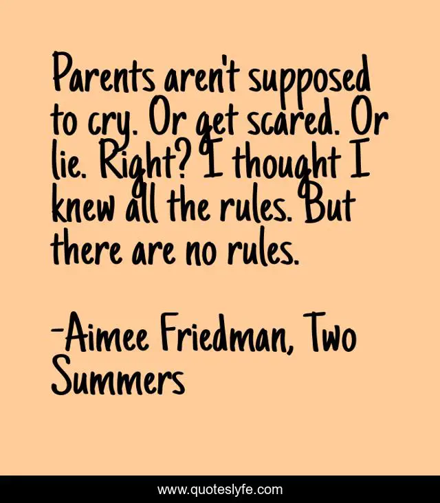 This page presents the quote "Parents aren't supposed to cry. Or get scared. Or lie. Right? I thought I knew all the rules. But there are no rules.". Author of this quote is Aimee Friedman, Two Summers. This quote is about summer, young-adult, expecatations, parents,.
