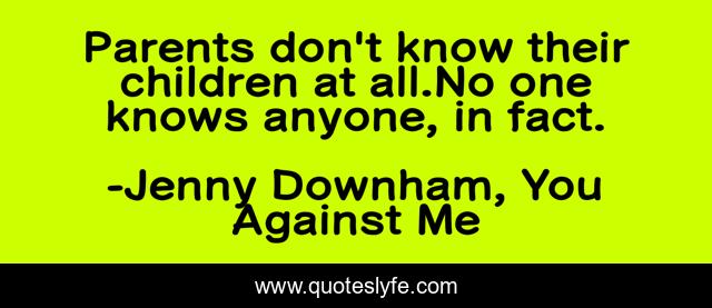 This page presents the quote "Parents don't know their children at all.No one knows anyone, in fact.". Author of this quote is Jenny Downham, You Against Me. This quote is about life, trust, parents, children, knowledge-of-people,.