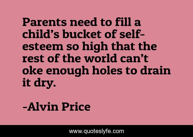 This page presents the quote "Parents need to fill a child’s bucket of self-esteem so high that the rest of the world can’t oke enough holes to drain it dry.". Author of this quote is Alvin Price. This quote is about parenting, children, self-esteem,.