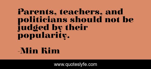 This page presents the quote "Parents, teachers, and politicians should not be judged by their popularity.". Author of this quote is Min Kim. This quote is about politician, popularity, politicians, parents, teachers, teacher,.