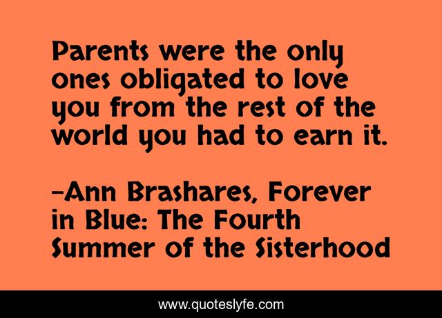 This page presents the quote "Parents were the only ones obligated to love you from the rest of the world you had to earn it.". Author of this quote is Ann Brashares, Forever in Blue: The Fourth Summer of the Sisterhood. This quote is about life, love, agape, family, unconditional-love, affection,.