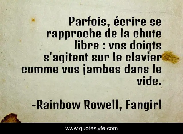 "Rainbow Rowell, Fangirl Quotes." Quoteslyfe.com, 2025. Mon. 08 Dec. 2025. <https://www.quoteslyfe.com/quote/Parfois-crire-se-rapproche-de-la-chute-22403>.