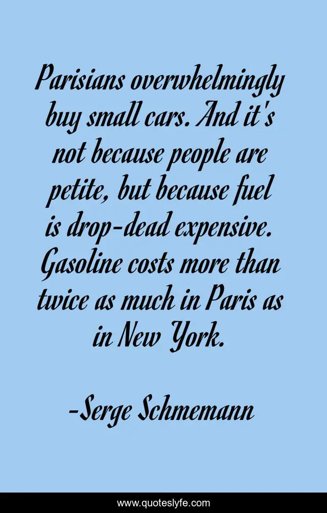 This page presents the quote "Parisians overwhelmingly buy small cars. And it's not because people are petite, but because fuel is drop-dead expensive. Gasoline costs more than twice as much in Paris as in New York.". Author of this quote is Serge Schmemann. This quote is about small, new york, people,.