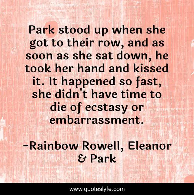 This page presents the quote "Park stood up when she got to their row, and as soon as she sat down, he took her hand and kissed it. It happened so fast, she didn't have time to die of ecstasy or embarrassment.". Author of this quote is Rainbow Rowell, Eleanor & Park. This quote is about love, quote, park, eleanor, kiss, eleanor-park, affection,.