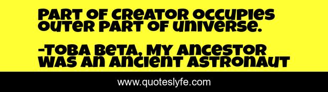 This page presents the quote "Part of Creator occupies outer part of universe.". Author of this quote is Toba Beta, My Ancestor Was an Ancient Astronaut. This quote is about universe, outer, creator,.