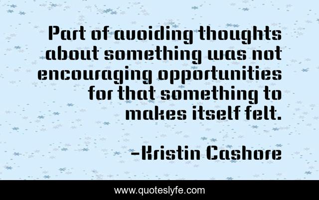 This page presents the quote "Part of avoiding thoughts about something was not encouraging opportunities for that something to makes itself felt.". Author of this quote is Kristin Cashore. This quote is about love, fire, avoid, hurt, pain, affection,.