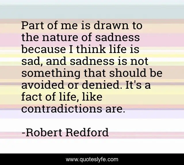 This page presents the quote "Part of me is drawn to the nature of sadness because I think life is sad, and sadness is not something that should be avoided or denied. It's a fact of life, like contradictions are.". Author of this quote is Robert Redford. This quote is about life, sadness, nature,.