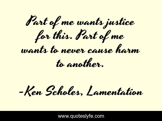 This page presents the quote "Part of me wants justice for this. Part of me wants to never cause harm to another.". Author of this quote is Ken Scholes, Lamentation. This quote is about justice, peace, vengeance,.