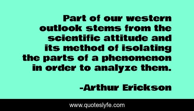 This page presents the quote "Part of our western outlook stems from the scientific attitude and its method of isolating the parts of a phenomenon in order to analyze them.". Author of this quote is Arthur Erickson. This quote is about outlook, part, order,.