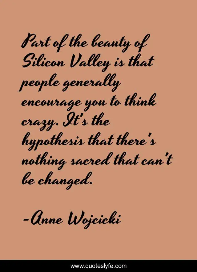 This page presents the quote "Part of the beauty of Silicon Valley is that people generally encourage you to think crazy. It's the hypothesis that there's nothing sacred that can't be changed.". Author of this quote is Anne Wojcicki. This quote is about crazy, think, people,.